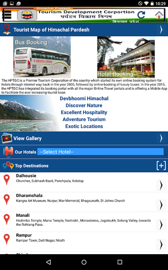 مع تطبيق HPTDC ، يمكنك الوصول إلى معلومات حول أماكن الجذب السياحي والفنادق والرياضات المغامرة ومرافق المؤتمرات وكيفية الوصول إلى ولاية هيماشال براديش ، كل ذلك في وضع عدم الاتصال بالإنترنت. يتضمن التطبيق أيضًا معرض صور ومعلومات الاتصال لمكاتب الحجز. حتى يتيح لك حجز الفنادق والحافلات مباشرة من التطبيق.
